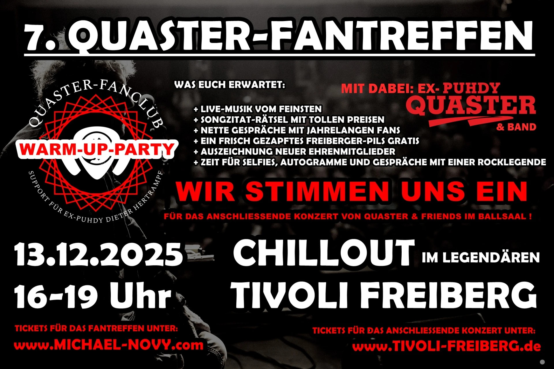 Am 13. Dezember 2025 lud der Quaster-Fanclub zum nunmehr 7. Quaster-Fantreffen ein. Diesmal ins legendäre Freiberger Tivoli! Dort wo die PUHDYS 1969 ihr erstes Konzert spielten, wollten wir uns auf das (direkt im Anschluss stattfindende) Konzert von Ex-Puhdy Dieter "Quaster" Hertrampf und seiner aktuellen Band einstimmen.
